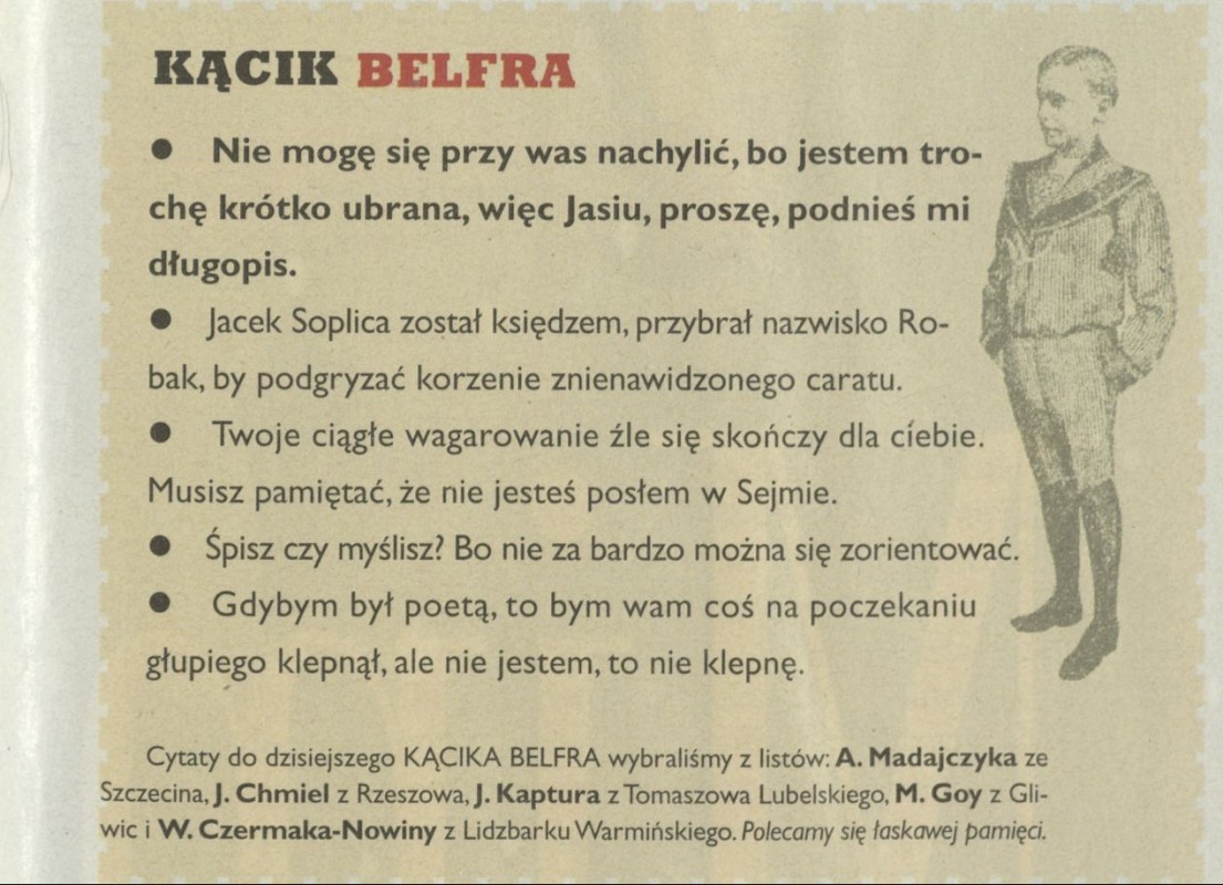 Archiwum nr 2687-88 (51-52/1996) 33/2857 Podziel się Tytuł Kącik belfra Artykuł z numeru 2687-88 (51/1996) Data wydania 22 grudnia 1996 Tagi powiedzonka
