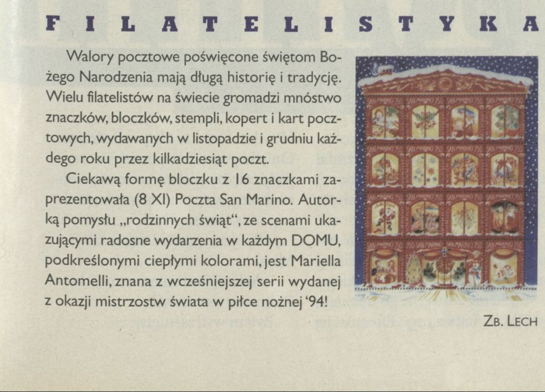 Archiwum / Filatelistyka nr 2687-88 (51-52/1996) 9375/123969 Podziel się Tytuł Filatelistyka Autor Zb.Lech Rubryka Filatelistyka Artykuł z numeru 2687-88 (51/1996) Data wydania 22 grudnia 1996 Tagi znaczki pocztowe