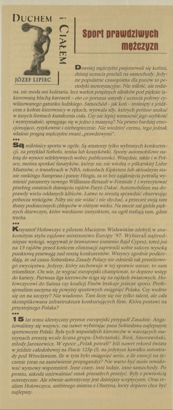 Archiwum / Sport nr 2730 (42/1997) 117052/123969 Podziel się Tytuł Sport prawdziwych mężczyzn Autor Józef Lipiec Rubryka Sport Artykuł z numeru 2730 (42/1997) Data wydania 19 października 1997