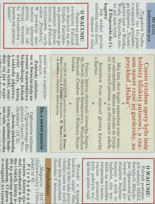 Archiwum / O Wacusiu nr 2687-88 (51-52/1996) 2854/2857 Podziel się Tytuł O Wacusiu Rubryka O Wacusiu Artykuł z numeru 2687-88 (51/1996) Data wydania 22 grudnia 1996 Tagi Falczak