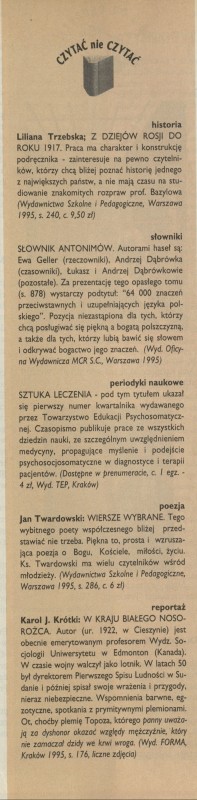 Archiwum / Czytać albo nie czytać? nr 2614 (31/1995) 125/217 Podziel się Tytuł Czytać nie czytać Rubryka Czytać albo nie czytać? Artykuł z numeru 2614 (31/1995) Data wydania 30 lipca 1995 Tagi Jan Twardowski Karol J. Krótki Sztuka leczenia