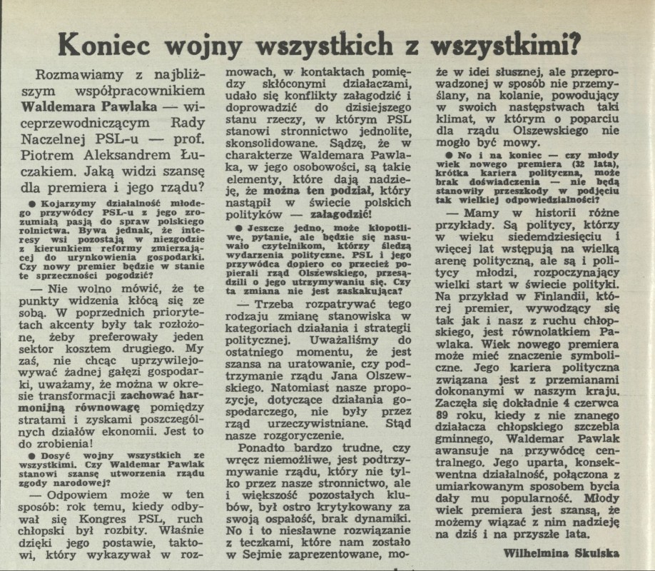 Archiwum / Społeczeństwo nr 2451 (24/1992) 08/17 Podziel się Tytuł Koniec wojny wszystkich z wszystkimi Autor Skulska Wilelmina Kategoria Społeczeństwo Artykuł z numeru 2451 (2452/1992) Data wydania 14 czerwca 1992 Tagi Waldemar Pawlak