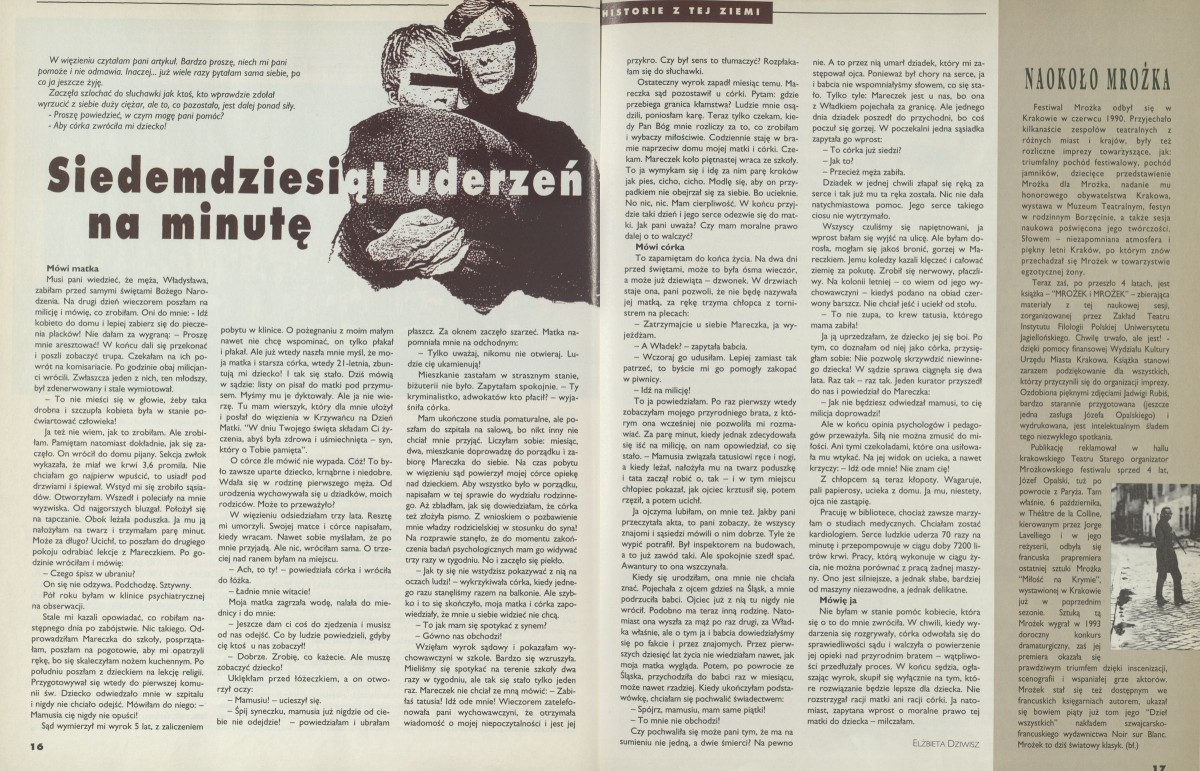 Archiwum / Opowiadanie nr 2579 (48/1994) 108498/123969 Podziel się Tytuł Siedemdziesiąt uderzeń na minutę Autor Elżbieta Dziwisz Kategoria Opowiadanie Artykuł z numeru 2579 (48/1994) Data wydania 7 listopada 1994
