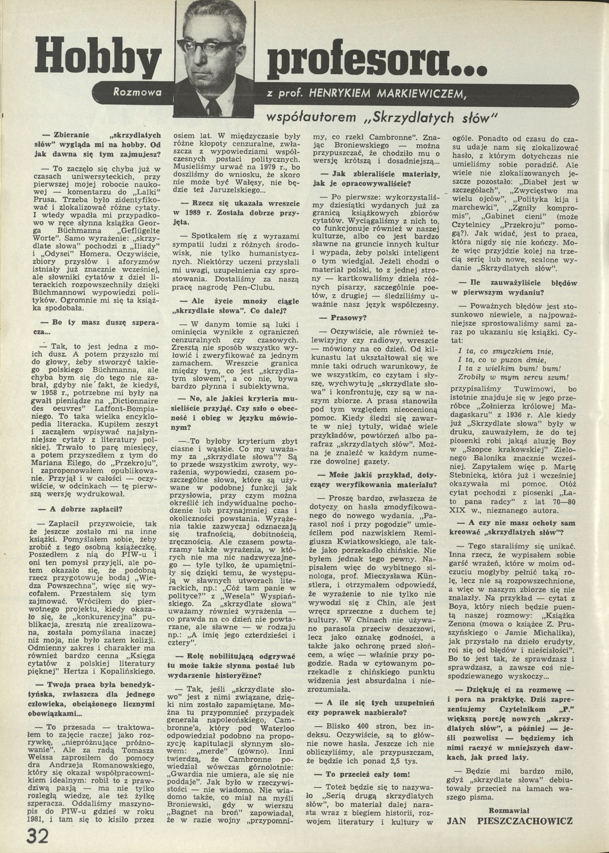 Archiwum / Wywiad nr 2449 (24/1992) 30/91 Podziel się Tytuł Hobby profesora Autor Jan Pieszczachowicz Kategoria Wywiad Artykuł z numeru 2449 (2450/1992) Data wydania 31 maja 1992 Tagi Henryk Markiewicz