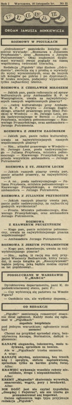 Archiwum / Pigułki - organ Janusza Minkiewicza nr 136 (46/1947) 24/214 Podziel się Tytuł Pigułki – organ Janusza Minkiewicza Autor Janusz Minkiewicz Rubryka Pigułki - organ Janusza Minkiewicza Artykuł z numeru 136 (46/1947) Data wydania 16 listopada 1947 Tagi satyra Miłosz Zagórski Lec Przyboś Pruszyński