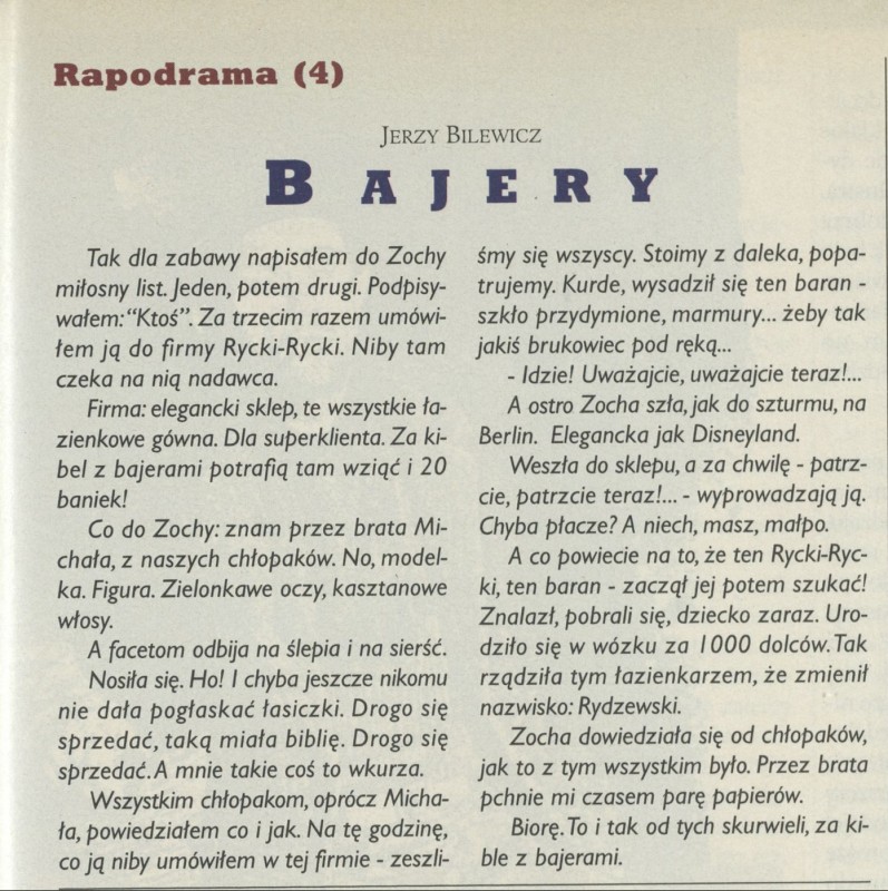 Archiwum / Proza nr specjalny 22/1996 64/138 Podziel się Tytuł Rapodrama (4) Bajery Autor Jerzy Bilewicz Kategoria Proza Artykuł z numeru nr specjalny 22/1996 Data wydania 2 czerwca 1996