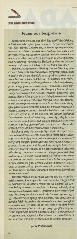 Archiwum nr 2702 (14/1997) 376/500 Podziel się Tytuł Przemoc i bezprawie Autor Jerzy Piekarczyk Artykuł z numeru 2702 (14/1997) Data wydania 6 kwietnia 1997 Tagi inwektywy