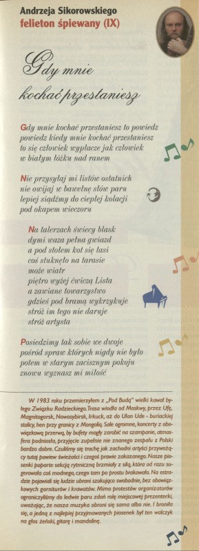 Archiwum / Felieton nr 2702 (14/1997) 115370/123969 Podziel się Tytuł Gdy mnie kochać przestaniesz Autor Andrzej Sikorowski Kategoria Felieton Artykuł z numeru 2702 (14/1997) Data wydania 6 kwietnia 1997 Tagi felieton śpiewany