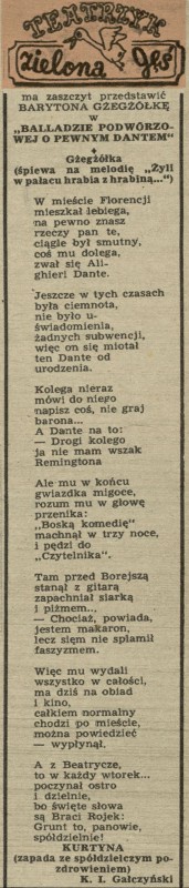 Archiwum / Teatrzyk Zielona Gęś nr 136 (46/1947) 94/324 Podziel się Tytuł Ballada podwórzowa o pewnym Dantem Autor Konstanty Ildefons Gałczyński Rubryka Teatrzyk Zielona Gęś Artykuł z numeru 136 (46/1947) Data wydania 16 listopada 1947 Tagi groteska humor scenka rodzajowa gag