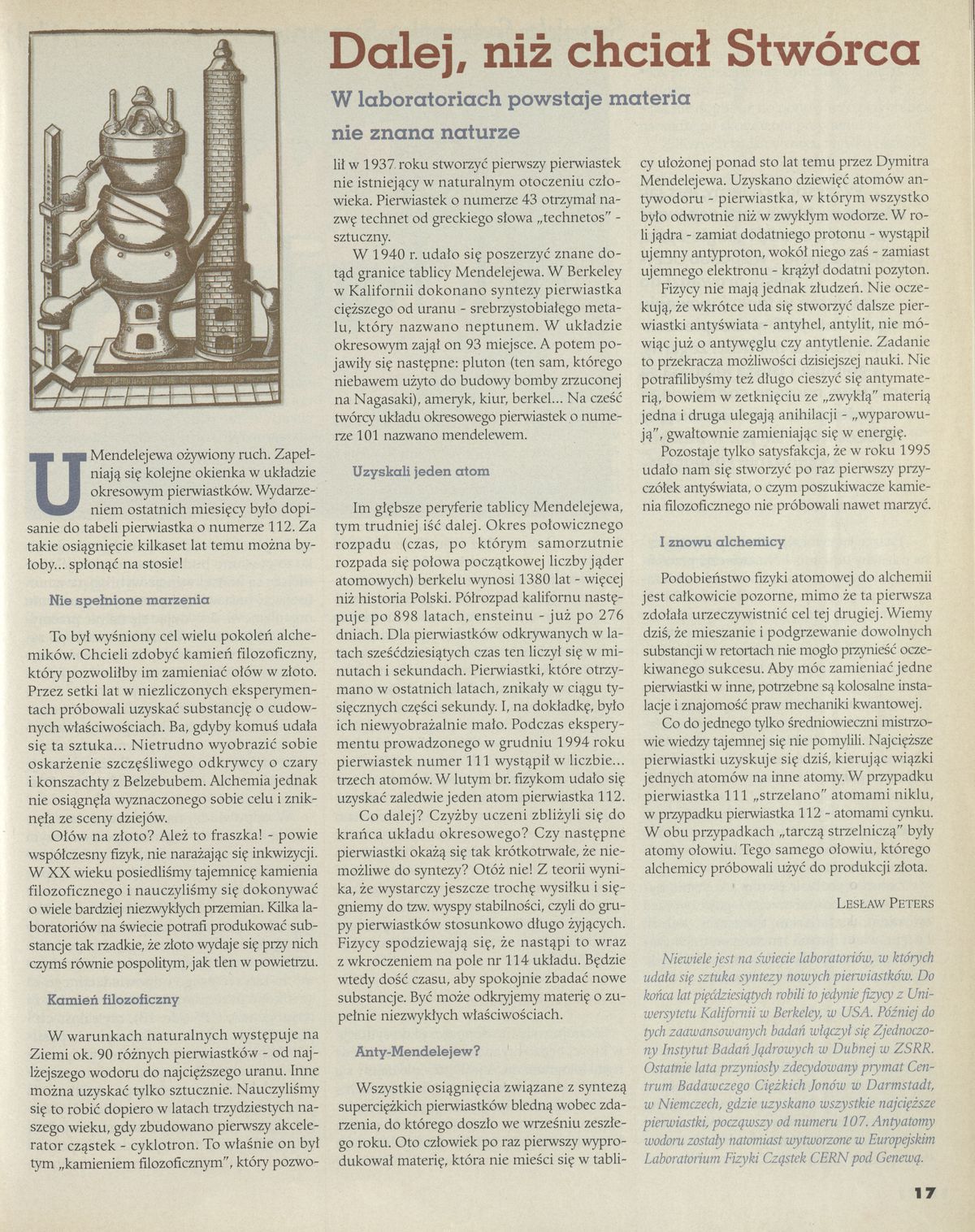 Archiwum / Nauka nr specjalny 23/1996 10979/123969 Podziel się Tytuł Dalej, niż chciał Stwórca Autor Lesław Peters Kategoria Nauka Artykuł z numeru nr specjalny 23/1996 Data wydania 9 czerwca 1996 Tagi materia laboratoria alchemia historia
