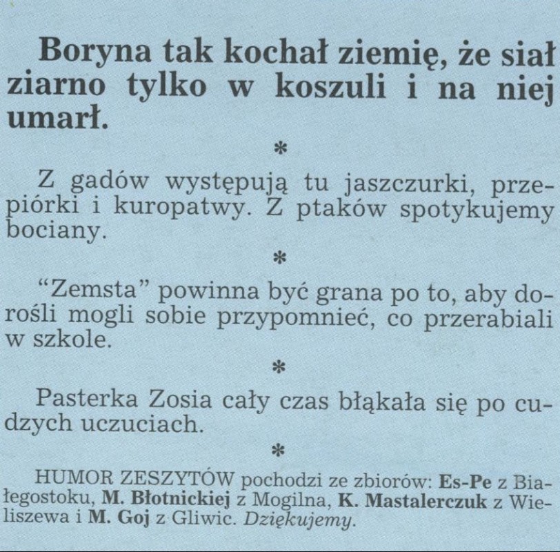 Archiwum / Humor zeszytów szkolnych nr 2615 (32/1995) 42/82 Podziel się Tytuł Humor zeszytów Rubryka Humor zeszytów szkolnych Artykuł z numeru 2615 (32/1995) Data wydania 6 sierpnia 1995 Tagi humor zeszytów