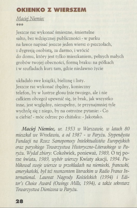 Archiwum / Okienko z wierszem nr 2616 (33/1995) 55/97 Podziel się Tytuł Okienko z wierszem Rubryka Okienko z wierszem Artykuł z numeru 2616 (33/1995) Data wydania 13 sierpnia 1995 Tagi maciej niemiec poezja