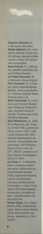 Archiwum / Różności nr 2707 (19/1997) 1/1 Podziel się Tytuł Zmarli Kategoria Różności Artykuł z numeru 2707 (19/1997) Data wydania 11 maja 1997 Tagi Falkowski Pisarski Raczyński Tłuchowski Wittek Mira Zylber Zipper