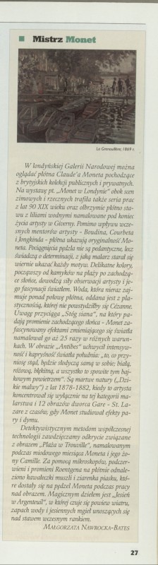 Archiwum / Recenzja nr 2707 (19/1997) 5/6 Podziel się Tytuł Mistrz Monet Autor Małgorzata Nawrocka-Bates Kategoria Recenzja Artykuł z numeru 2707 (19/1997) Data wydania 11 maja 1997 Tagi malarstwo francuskie malarz impresjonizm