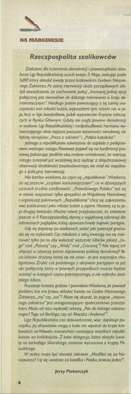Archiwum nr 2708 (20/1997) 4/7 Podziel się Tytuł Rzeczpospolita szalikowców Autor Jerzy Piekarczyk Artykuł z numeru 2708 (20/1997) Data wydania 18 maja 1997 Tagi pseudokibice