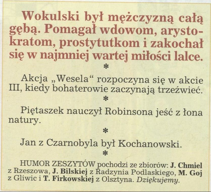Archiwum / Humor zeszytów szkolnych nr specjalny 25/1996 34/73 Podziel się Tytuł [Wokulski był mężczyzną całą gębą...] Rubryka Humor zeszytów szkolnych Artykuł z numeru nr specjalny 25/1996 Data wydania 23 czerwca 1996 Tagi humor zeszytów szkolnych rozmaitości