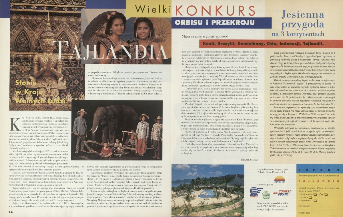 Archiwum / Konkurs nr 2620 (37/1995) 06/11 Podziel się Tytuł Wielki konkurs Orbisu Rubryka Konkurs Artykuł z numeru 2620 (37/1995) Data wydania 10 września 1995 Tagi konkurs Orbis podróże tajlandia