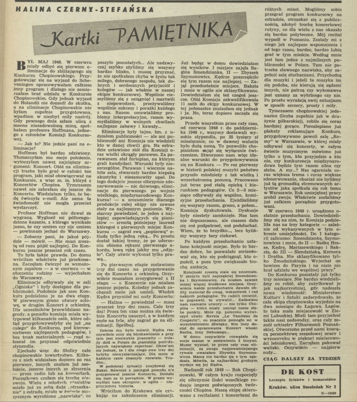 Archiwum / Dziennik nr 448 (45/1953) 28/58 Podziel się Tytuł Kartki pamiętnika Autor Halina Czerny Stefańska Kategoria Dziennik Artykuł z numeru 448 (45/1953) Data wydania 8 listopada 1953 Tagi fortepian pianistka chopinistka muzyka