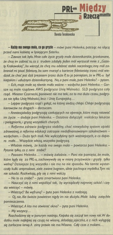 Archiwum / Felieton nr specjalny 2801/1999 512/602 Podziel się Tytuł Między PRL-em a Rzecząpospolitą Autor Dorota Terakowska Kategoria Felieton Artykuł z numeru nr specjalny 2801/1999 Data wydania 21 lutego 1999 Tagi mole