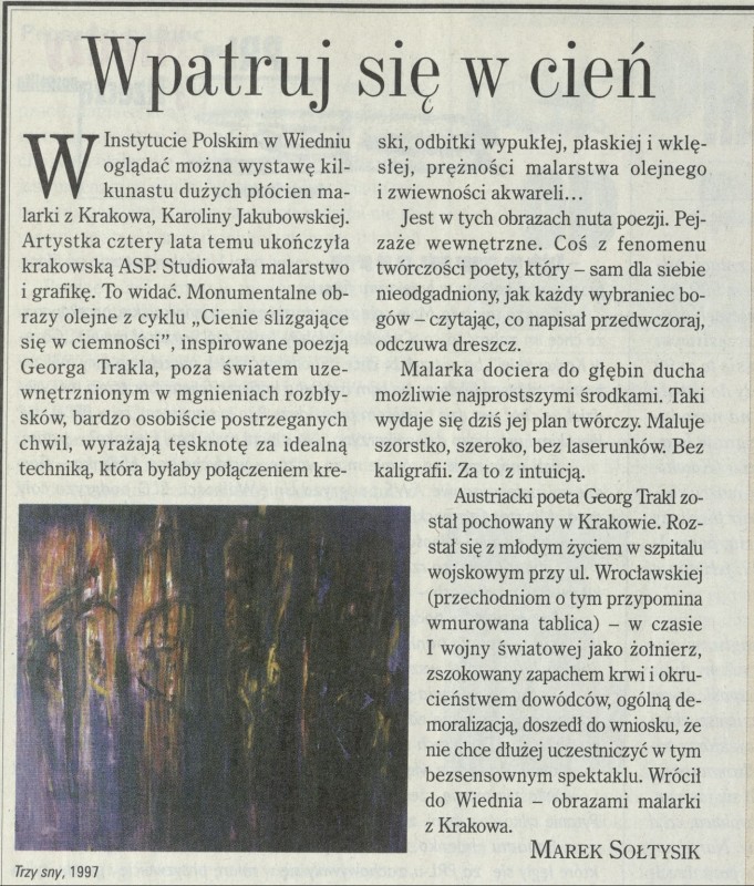 Archiwum / Kultura nr specjalny 2801/1999 13/48 Podziel się Tytuł Wpatruj się w cień Autor Marek Sołtysik Kategoria Kultura Artykuł z numeru nr specjalny 2801/1999 Data wydania 21 lutego 1999 Tagi sztuka Wiedeń Karolina Jakubowska