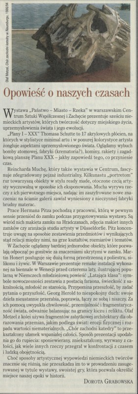 Archiwum / Kultura nr specjalny 2801/1999 53/54 Podziel się Tytuł Opowieść o naszych czasach Autor Dorota Grabowska Kategoria Kultura Artykuł z numeru nr specjalny 2801/1999 Data wydania 21 lutego 1999 Tagi wystawa "Państwo - Miasto - Rzeka" CentrumSztuki Współczesnej Zachęta Reinhard Mucha Herman Pitz