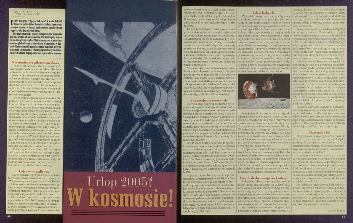 Archiwum / Artykuł nr 2734 (46/1997) 21/23 Podziel się Tytuł Urlop 2005? W kosmosie! Autor Lesław Peters Kategoria Artykuł Artykuł z numeru 2734 (46/1997) Data wydania 16 listopada 1997