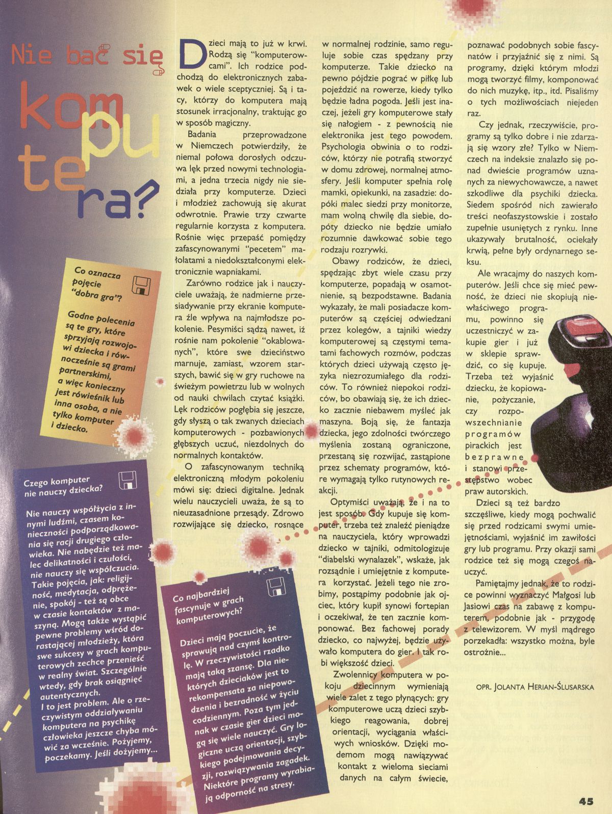 Archiwum / Artykuł nr 2586 (03/1995) 109075/123969 Podziel się Tytuł Nie bać się komputera Autor Jolanta Herian-Ślusarska Kategoria Artykuł Artykuł z numeru 2586 (3/1995) Data wydania 15 stycznia 1995 Tagi komputer