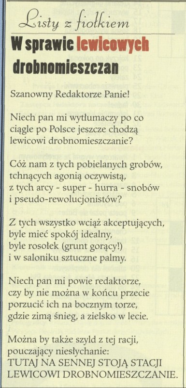 Archiwum / Listy z fiołkiem nr 2735 (47/1997) 40/48 Podziel się Tytuł W sprawie lewicowych drobnomieszczan Autor Konstatny Ildefons (Karakuliambro) Gałczyński Rubryka Listy z fiołkiem Artykuł z numeru 2735 (47/1997) Data wydania 23 listopada 1997