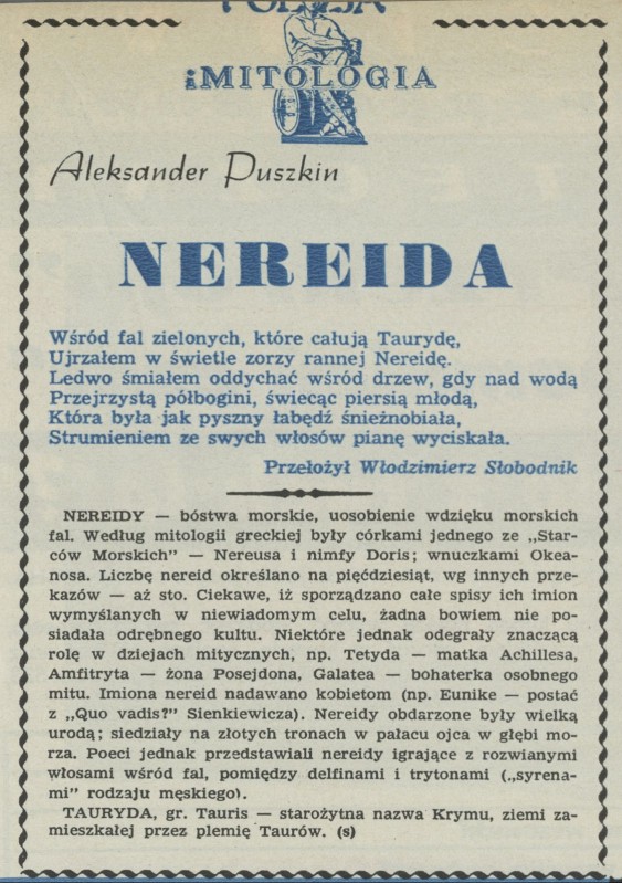 Archiwum / Poezja nr 2426-27 (24-24/1991) 100566/123969 Podziel się Tytuł Poezja i mitologia. Nereida Autor Aleksander Puszkin Kategoria Poezja Artykuł z numeru 2426-27 (2427/1991) Data wydania 22 grudnia 1991