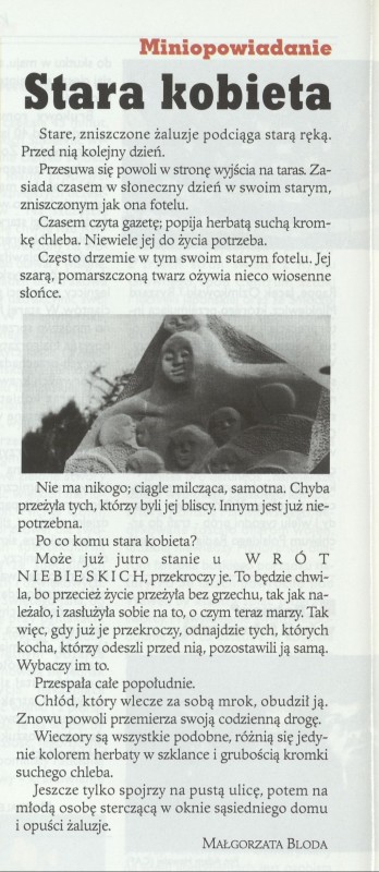 Archiwum / Proza nr specjalny 28/1996 113270/123969 Podziel się Tytuł Miniopowiadanie. Stara kobieta Autor Małgorzata Bloda Kategoria Proza Artykuł z numeru nr specjalny 28/1996 Data wydania 14 lipca 1996