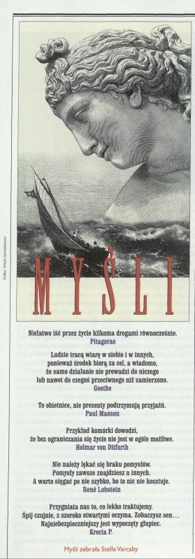 Archiwum / Myśli nr 2736 (48/1997) 39/43 Podziel się Tytuł Myśli Autor Stella Varcaby Rubryka Myśli Artykuł z numeru 2736 (48/1997) Data wydania 30 listopada 1997 Tagi cytaty aforyzmy
