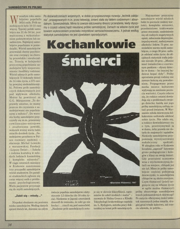 Archiwum / Artykuł nr 2756 (27/1998) 17/25 Podziel się Tytuł Kochankowie śmierci Autor Monika Wąs Kategoria Artykuł Artykuł z numeru 2756 (2757/1998) Data wydania 19 kwietnia 1998 Tagi samobójstwo