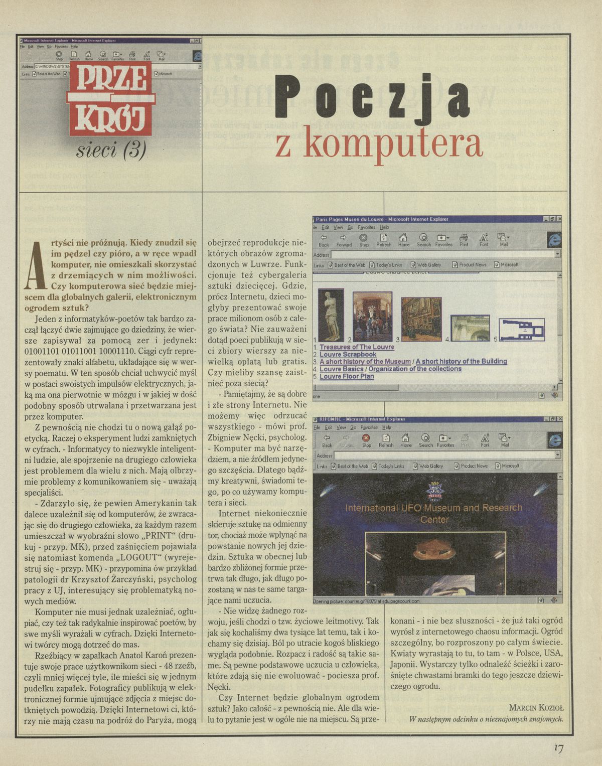 Archiwum / Artykuł nr 2743 (27/1998) 117737/123969 Podziel się Tytuł Poezja z komputera Autor Marcin Kozioł Kategoria Artykuł Artykuł z numeru 2743 (2744/1998) Data wydania 18 stycznia 1998 Tagi sieci