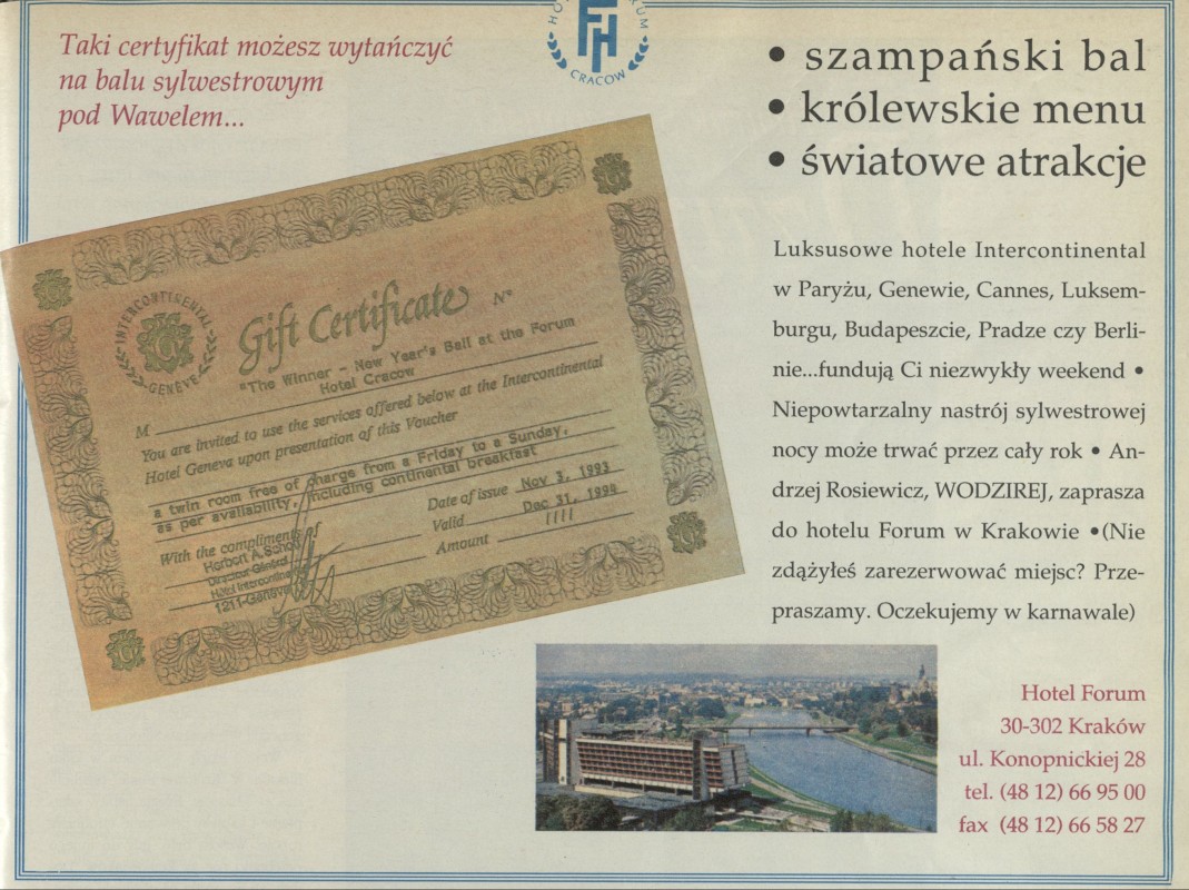 Archiwum / Reklamy nr 2530-31 (51-52/1993) 38/51 Podziel się Tytuł [Bal sylwestrowy pod Wawelem] Rubryka Reklamy Artykuł z numeru 2530-31 (51/1993) Data wydania 19 grudnia 1993