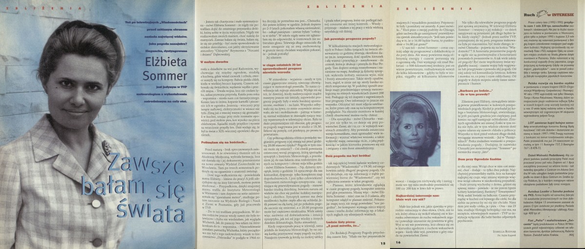 Archiwum / Reportaż nr specjalny 29/1996 74/230 Podziel się Tytuł Zawsze bałam się świata Autor Izabella Bodnar Kategoria Reportaż Artykuł z numeru nr specjalny 29/1996 Data wydania 21 lipca 1996 Tagi Elżbieta Sommer meteorolog TVP