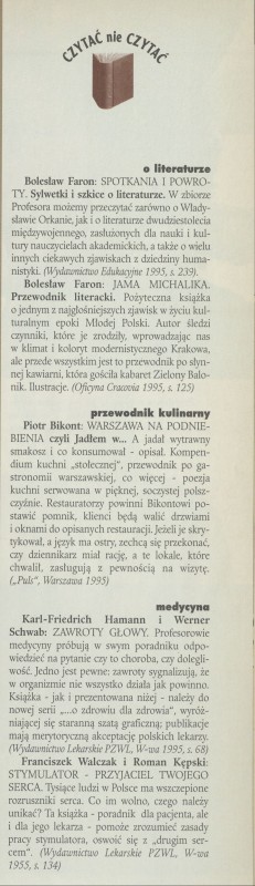 Archiwum / Czytać albo nie czytać? nr 2621 (38/1995) 110991/123969 Podziel się Tytuł Czytać nie czytać Rubryka Czytać albo nie czytać? Artykuł z numeru 2621 (38/1995) Data wydania 17 września 1995 Tagi Bolesław Faron Jama Michalika