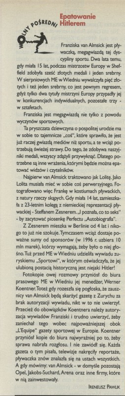 Archiwum / Sport nr 2621 (38/1995) 1/2 Podziel się Tytuł Wolny pośredni. Epatowanie Hitlerem Autor Ireneusz Pawlik Kategoria Sport Artykuł z numeru 2621 (38/1995) Data wydania 17 września 1995 Tagi sport pływanie Franziska van Almsick