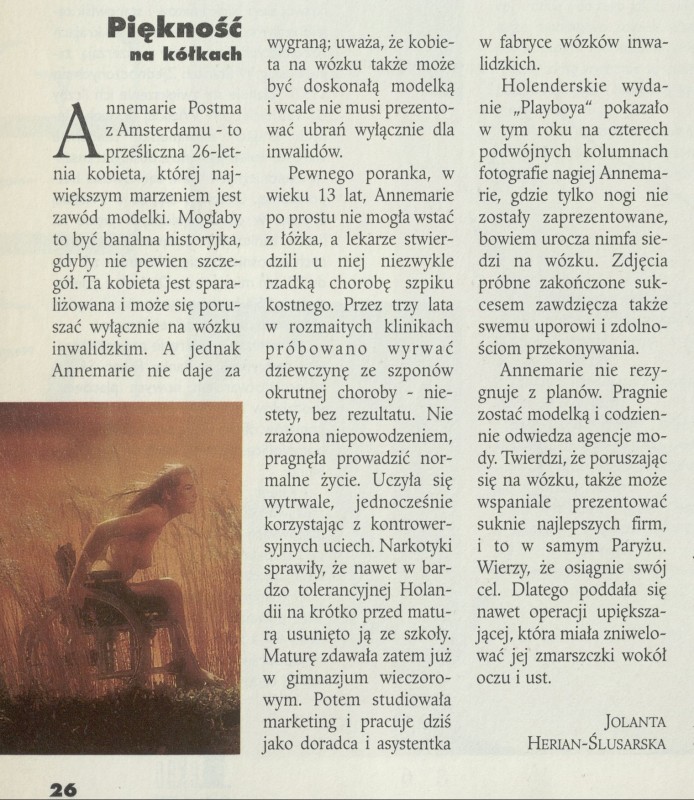 Archiwum / Różności nr 2622 (39/1995) 111047/123969 Podziel się Tytuł Piękność na kółkach Autor Jolanta Herian-Ślusarska Kategoria Różności Artykuł z numeru 2622 (39/1995) Data wydania 24 września 1995 Tagi Annemarie Postma modeling niepełnosprawność