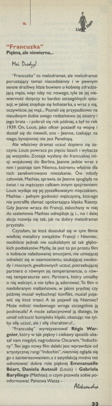 Archiwum / Listy o filmie nr 2622 (39/1995) 111065/123969 Podziel się Tytuł Listy o filmie Autor Aleksandra Rubryka Listy o filmie Artykuł z numeru 2622 (39/1995) Data wydania 24 września 1995 Tagi francuzka film