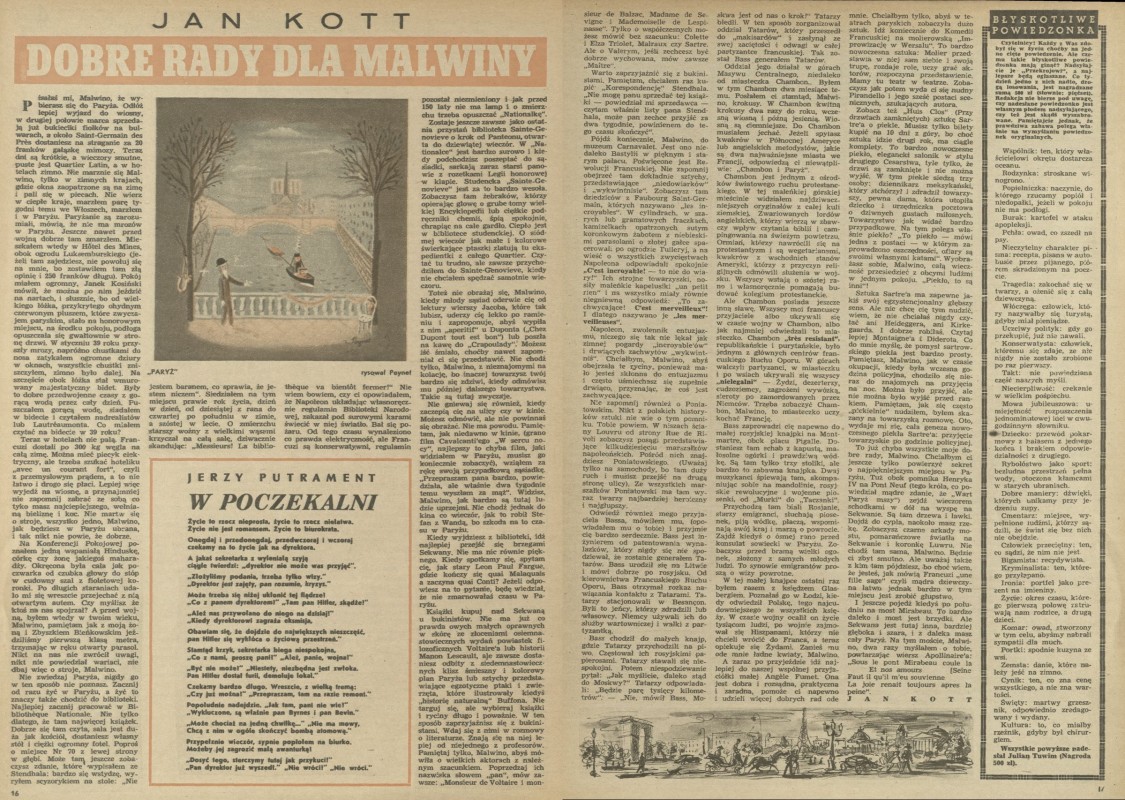 Archiwum / Proza nr 89-90 (51-52/1946) 31/96 Podziel się Tytuł Dobre rady dla Malwiny Autor Jan Kott Kategoria Proza Artykuł z numeru 89-90 (51/1946) Data wydania 22 grudnia 1946 Tagi Paryż