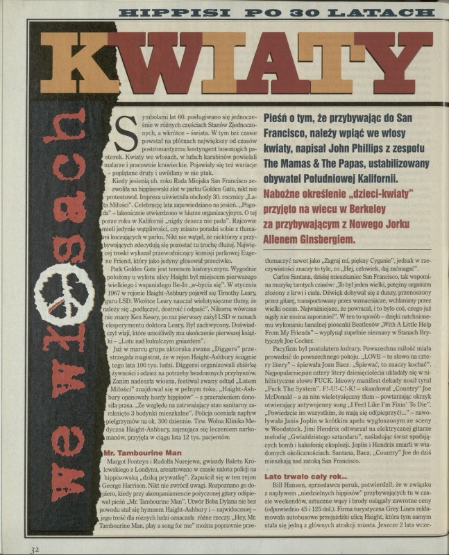 Archiwum / Artykuł nr 2780 (27/1998) 4105/123969 Podziel się Tytuł Kwiaty we włosach Autor Jerzy Piekarski Kategoria Artykuł Artykuł z numeru 2780 (2781/1998) Data wydania 14 października 1998 Tagi hippisi
