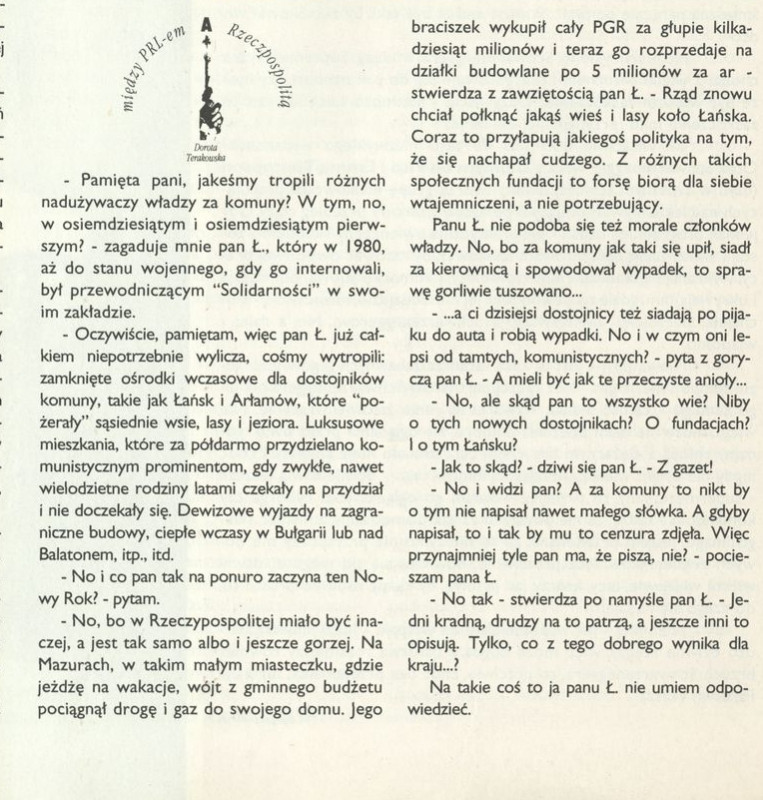 Archiwum / Różności nr 2587 (04/1995) 58/1181 Podziel się Tytuł Między PRL-em a Rzecząpospolitą Autor Dorota Terakowska Kategoria Różności Artykuł z numeru 2587 (4/1995) Data wydania 22 stycznia 1995
