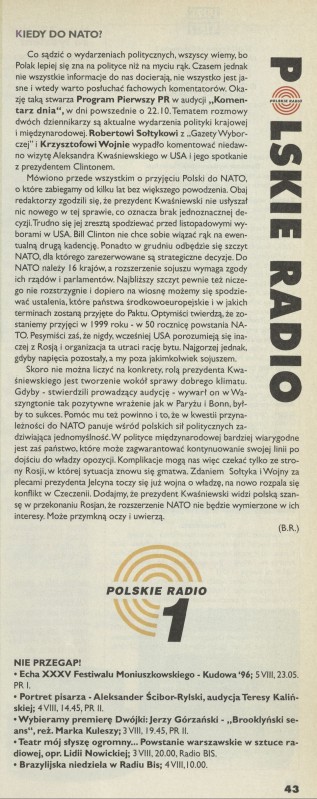 Archiwum / Artykuł nr 2667 (31/1996) 113476/123969 Podziel się Tytuł Kiedy do NATO? Autor B.R. Kategoria Artykuł Artykuł z numeru 2667 (31/1996) Data wydania 4 sierpnia 1996 Tagi Polskie Radio audycje