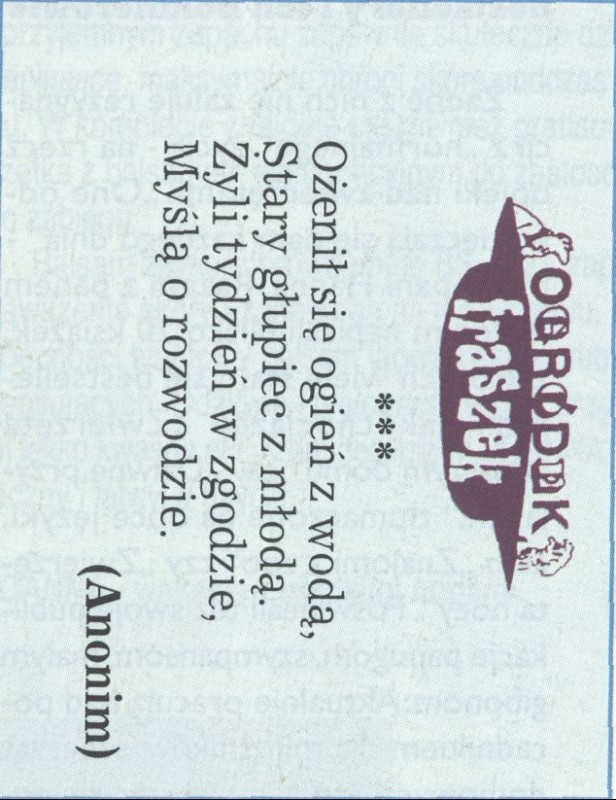 Archiwum / Fraszki nr 2667 (31/1996) 135/206 Podziel się Tytuł *** (Ożenił się ogień z wodą...) Rubryka Fraszki Artykuł z numeru 2667 (31/1996) Data wydania 4 sierpnia 1996 Tagi fraszki wiersz humor