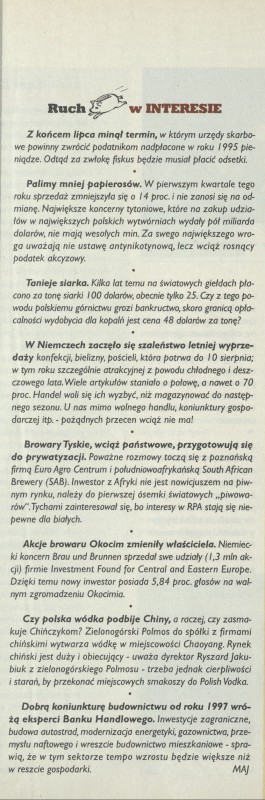 Archiwum / Różności nr specjalny 32/1996 113550/123969 Podziel się Tytuł Ruch w interesie Autor maj Kategoria Różności Artykuł z numeru nr specjalny 32/1996 Data wydania 11 sierpnia 1996 Tagi gospodarka finanse