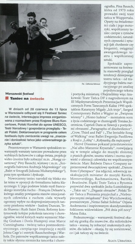 Archiwum / Kultura nr specjalny 32/1996 113561/123969 Podziel się Tytuł Warszawski Festiwal Taniec na świecie Autor Agata Urbańska Kategoria Kultura Artykuł z numeru nr specjalny 32/1996 Data wydania 11 sierpnia 1996