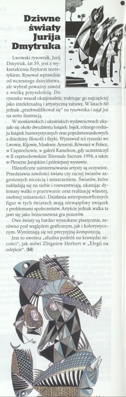 Archiwum / Kultura nr specjalny 32/1996 113565/123969 Podziel się Tytuł Dziwne światy Jurija Dmytruka Kategoria Kultura Artykuł z numeru nr specjalny 32/1996 Data wydania 11 sierpnia 1996 Tagi rysownik Jurij Dmytruk