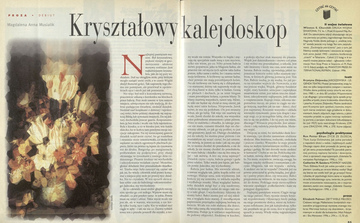 Archiwum / Proza nr specjalny 32/1996 1060/2857 Podziel się Tytuł Kryształowy kalejdoskop Autor Magdalena Anna Musialik Kategoria Proza Artykuł z numeru nr specjalny 32/1996 Data wydania 11 sierpnia 1996 Tagi debiut proza Magdalena Anna Musialik