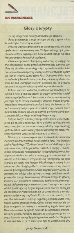 Archiwum / Felieton nr specjalny 33/1996 467/631 Podziel się Tytuł Na marginesie. Głosy z krypty Autor Jerzy Piekarczyk Kategoria Felieton Artykuł z numeru nr specjalny 33/1996 Data wydania 18 sierpnia 1996 Tagi polityka prawica