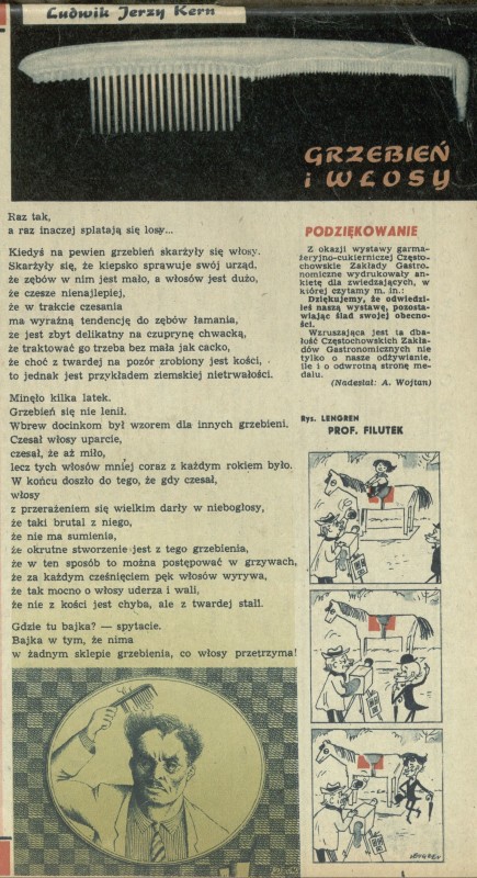 Archiwum / Rozmaitości [old] nr 472 (17/1954) 14/85 Podziel się Tytuł Grzebień i włosy Autor Ludwik Jerzy Kern Daniel Mróz Rubryka Rozmaitości [old] Artykuł z numeru 472 (17/1954) Data wydania 25 kwietnia 1954